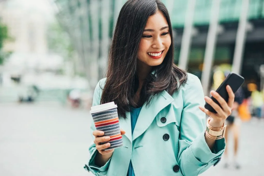 Smiling Asian Ethnicity woman holding a smart phone and a coffee cup, walking outdoors at urban environment.