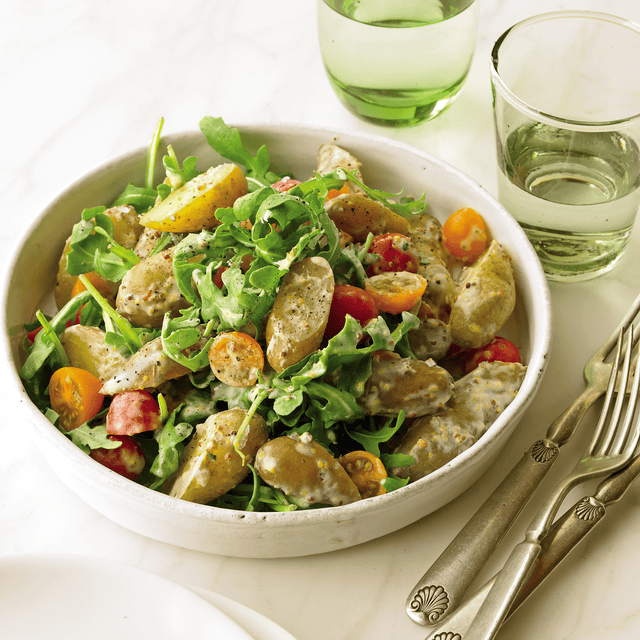 This bold, Mediterranean-inspired potato salad is packed with flavor thanks to a tangy mustard-anchovy dressing and crisp, peppery arugula. Creamy Greek yogurt keeps the dressing light, while cherry tomatoes add juicy sweetness. It’s a satisfying side that comes together in just 30 minutes—perfect for summer meals or easy entertaining.