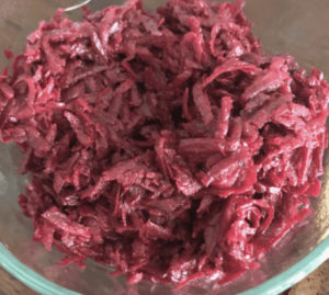 Einfach circa 3 mittelgroĂe rohe rote Beete waschen, schĂ€len und grob raspeln.
