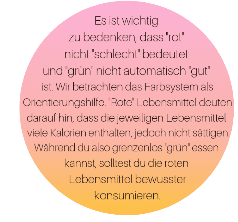 Noom hat ein einzigartiges Farbsystem entwickelt, welches dir auf einfache und übersichtliche Art und Weise zeigt, was in den Nahrungsmittel enthalten ist und dir dadurch hilft gesunde Essensentscheidungen zu treffen! Unser Farbsystem basiert auf dem Prinzip der Kalorien-Dichte und unterteilt alle Nahrungsmittel in rot, gelb und grüne Kategorien.